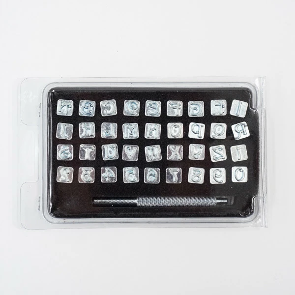 36 piece Alphabet / Number Realeather Stamp Set. Fancy font. Includes stamp handle and storage box. Letter height – 3/8″