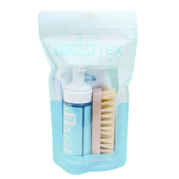 Angelus Foam-Tex Cleaning Kit. Comes with 5.7 oz bottle of Foam-Tex cleaner, hog hair cleaning brush, and a microfiber cloth.Get your kicks in tip top shape with our Angelus Foam TEX Cleaning Kit. This kit includes: Angelus Foam-Tex Gentle Foaming Cleaner – 5.7 fl. oz., Premium Hog Hair Sneaker Cleaning Brush, Premium Microfiber Towel. Itโs the EASY way to clean your sneakers! Angelus Foam-Tex Gentle Foaming Cleaner uses a pump handle that creates foam directly onto your sneakers. No more bowls, and no more water! Simply Pump, Scrub, & Dry! No more unnecessary steps and no more wasted product.