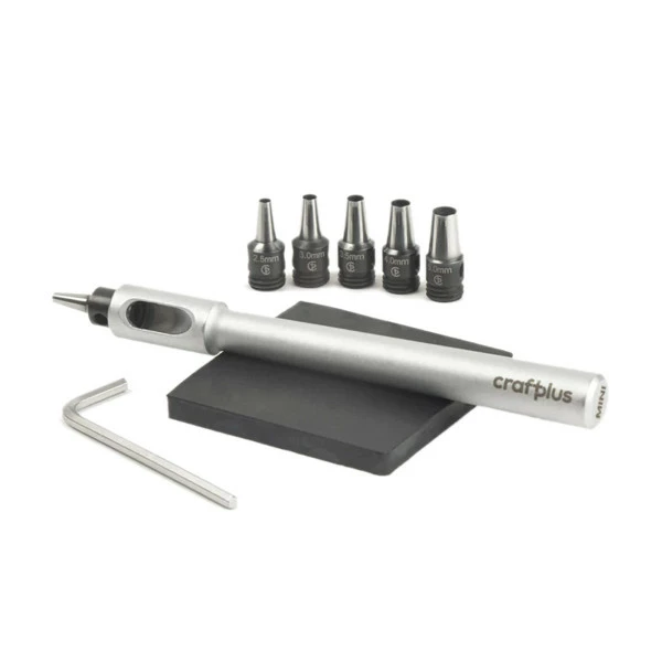 Precision machined mini punch set with six interchangeable punch tubes. Thin, razor-sharp tubes make punching easier, resulting in cleaner cuts. Designed for punching meticulous holes in leather, fabric, webbing, cardboard, and similar materials. Must be used with poundo board to prevent cutting edge damage during use. The set comes with a mini poundo board and Allen wrench.