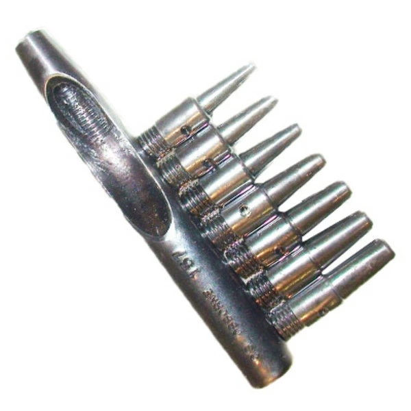 A special punch set designed for cutting small, precise holes in softer materials where throated or pliar punches just don’t reach. The handle has a slot to clear punchings easily and this set comes with 7 long and tapered replaceable punching tubes, sizes; 0-6. Once you own this set, you’ll wonder why they even make the others! U.S.Made! Item #88-0157.